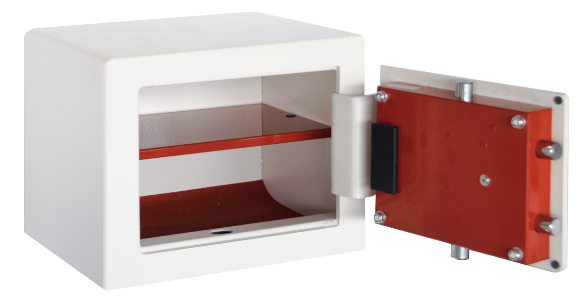 - Korpus i płyta czołowa drzwi w kolorze bieli alpejskiej RAL 9016, półka i osłona mechanizmu zamka oraz ryglowania w kolorze czerwonym RAL 3020